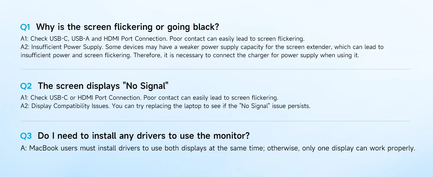 π»γPlug and PlayγIf your device has a full-featured type-c port and a USB3.0 port, you don't need to download any drivers to instantly light up both screens. Note: If your device's host port does not support USB3.0, you may need to install a driver to use it properly. Please don't hesitate to contact us for the driver.