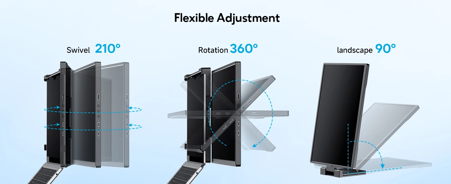 π»γEasy Customization of Display SettingsγThe monitor also offers customization options for brightness, contrast, and backlight, allowing you to customize the display to your preferences. The vertical/ horizontal screen positions, free rotation and adjustable kickstand offer flexibility in how you position the extended display for optimal viewing comfort.